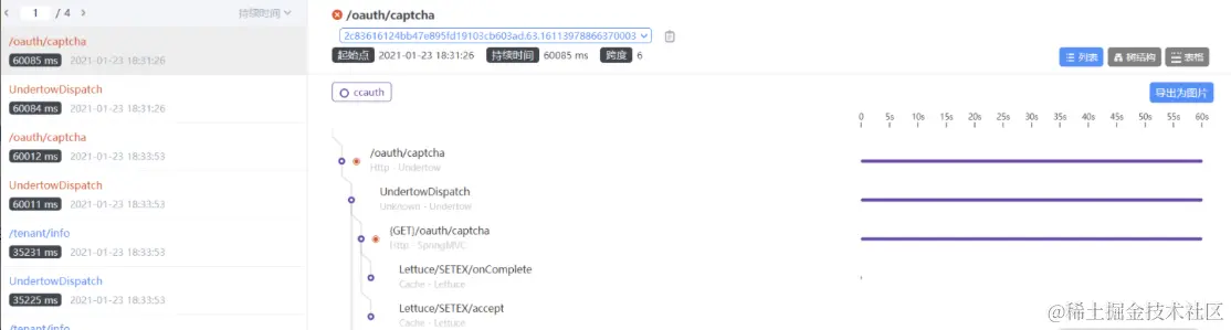 接下来我们测试下,比如 auth 服务获取验证码的接口出现错误,我们是可以在 SkyWalking 追踪页面清楚地看到的。同时对于其他相关的业务同学,也都可以在钉钉群收到报警信息,这样的方式在实际工作中非常实用。业务报错图和钉钉报警图如下所示: