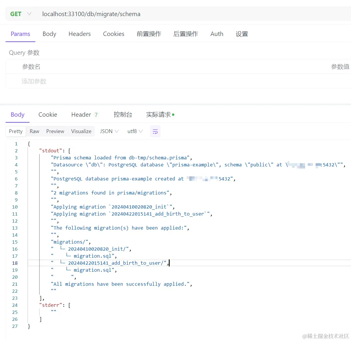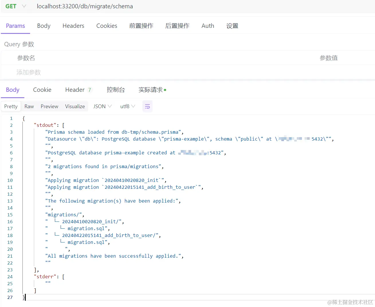 为了展示脚本执行的结果,调用接口前删除了prisma-example数据库。注意,这次端口已经变成了33200,通过二进制文件启动的容器服务端口