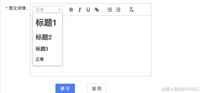 quill默认是英文的,并且高度也是只有一行,所以想自定义高度和汉化,就需要做一些配置,主要是通过添加css样式来修改高度和汉化:
