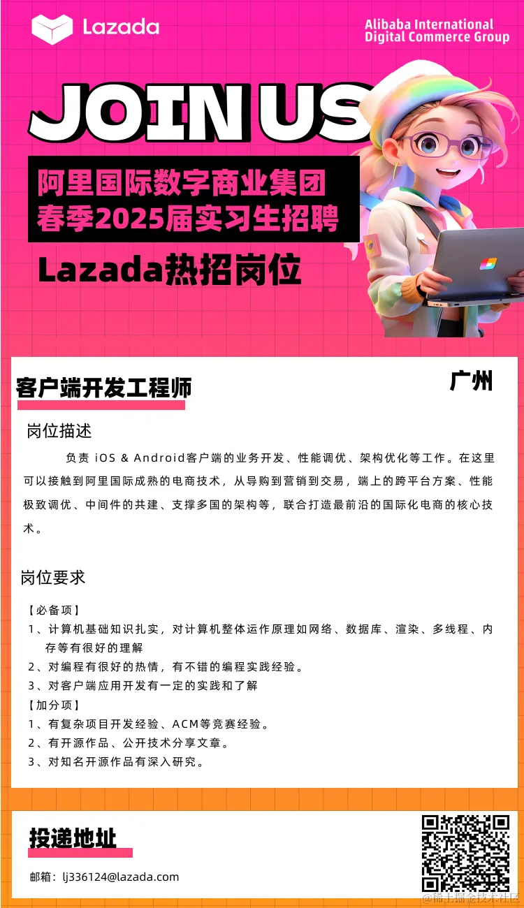 🎉阿里国际Lazada Buyer Tech25届实习生春招来啦!!!抓紧上车🚌 Matt1234 2024-04-22 61 阅读1分钟 部门直推,大量HC!暑期实习有留用转正机会!提前实习抢鲜一步拿下秋招offer!🎆 💰待遇丰厚,餐补、房补、交通补贴统统都有!😻 [热招岗位💼]客户端开发工程师-Android、客户端开发工程师-iOS、前端开发工程师 [实习城市📍]广州琶洲阿里中心 [关于我们🦁] 前端团队,负责买家端全链路电商场景的前端技术 客户端团队,负责无线APP的研发工作 扫描下方二维码,部门直推,流程快速,直达面试官