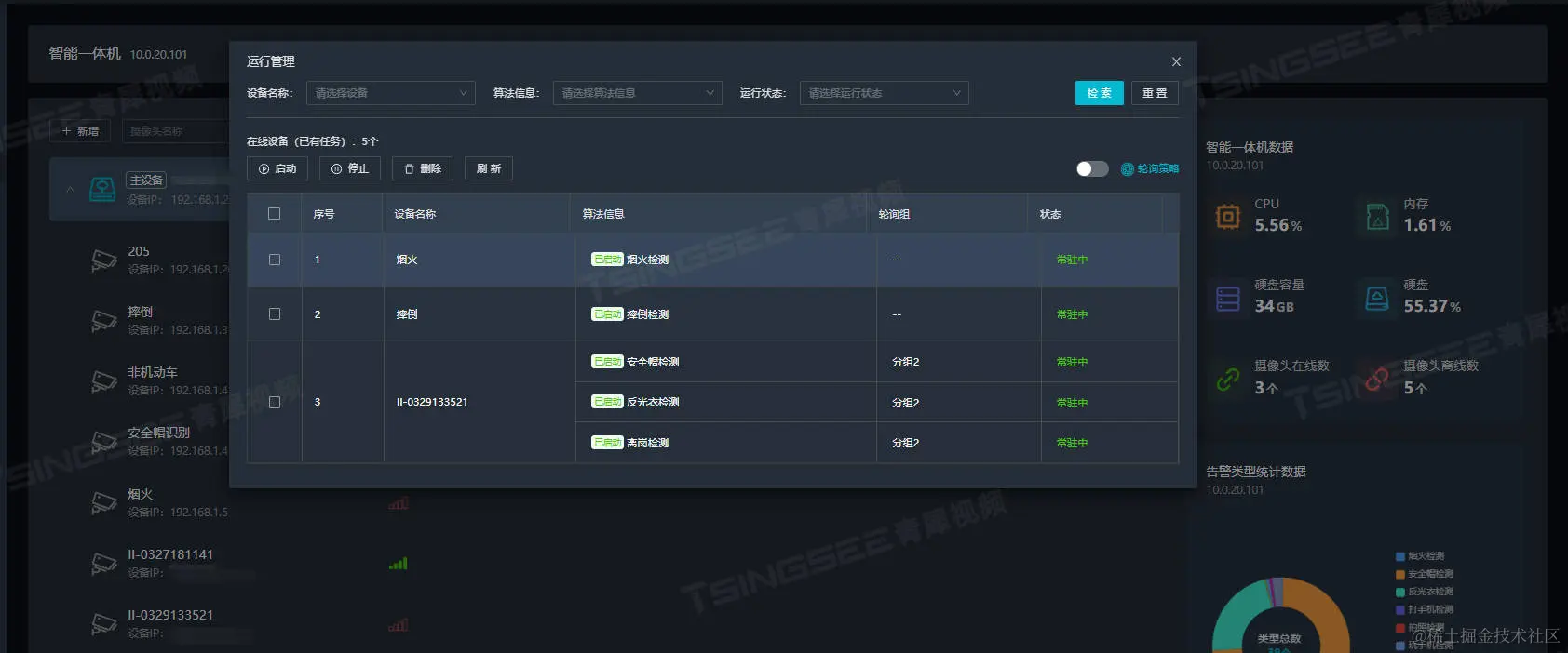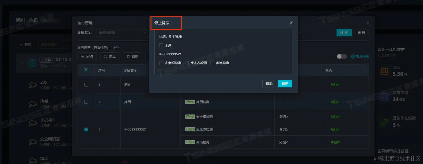2)选择要停止算法的设备,点击【停止】,可以多选或者单选算法,对其进行停止即可;