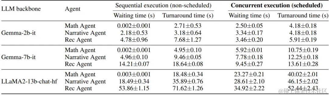 作者进行了AIOS使用FIFO调度和非调度方法(即顺序执行)的比较分析。结果表明,非调度方法对序列早期的Agent表现良好,但牺牲了序列后期Agent的等待时间和周转时间。相反,AIOS的调度机制有效地调节了等待时间和周转时间,特别是对于后续Agent的请求,当LLM较大时,这种优势尤为明显。这表明调度对于适应多个Agent的并行操作非常重要。