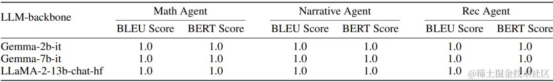 使用BLEU分数和BERT分数作为评估指标来评估多个Agent并行运行与单个Agent依次运行时输出的一致性。结果显示,BLEU和BERT分数都达到了1.0,表明多Agent和单Agent配置下生成的输出之间完全对齐,证实了设计在有效促进并行多Agent操作方面的一致性。