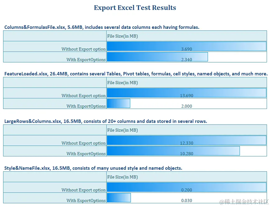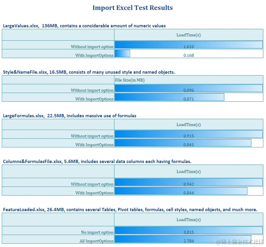 本博客主要介绍了加载 Excel (XLSX) 文件时导入选项的时间性能以及使用导出选项优化的文件大小。测试是在一些 Excel 文档上进行的,这些文档包含真实的函数、公式和多行多列的数据。