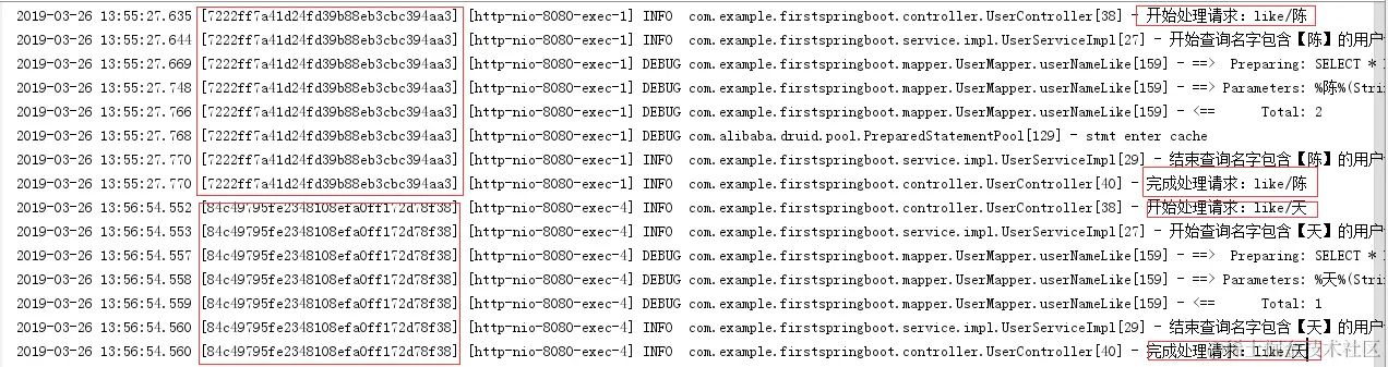 到此,springboot工程可以对每次接口调用产生的日志都标记唯一的编号。效果如下图所示: