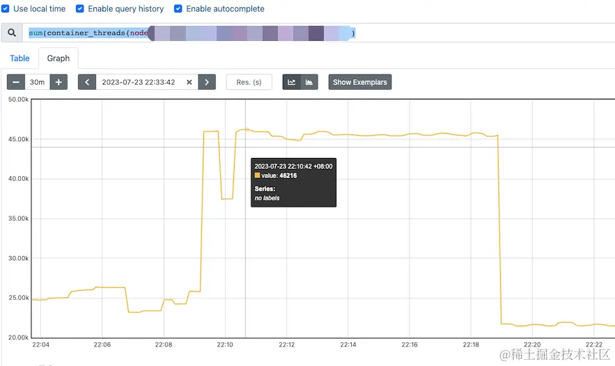 等等,还没完,到底是谁把 PID 耗尽了呢,还要找出真凶,容器总线程 突增,说明是某个容器造成的,安排promql 查,container_threads{node="node-xx"}