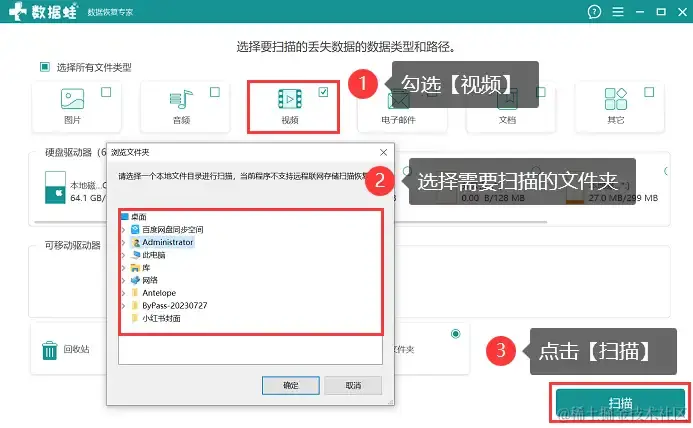 步骤1:将软件下载到电脑上后,运行软件后可以先选择 【免费试用】 ,进入选择界面即可勾选上 【视频】,并勾选上文件删除前所在的文件夹,单击【扫描】;