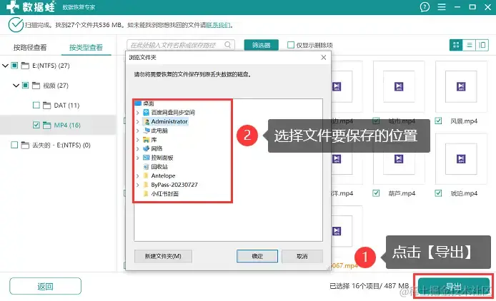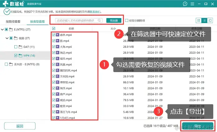 步骤3:将所有需要恢复的视频都勾选完毕后,只需点击【导出】,并勾选上一个合理的保存位置,等待导出完成即可。