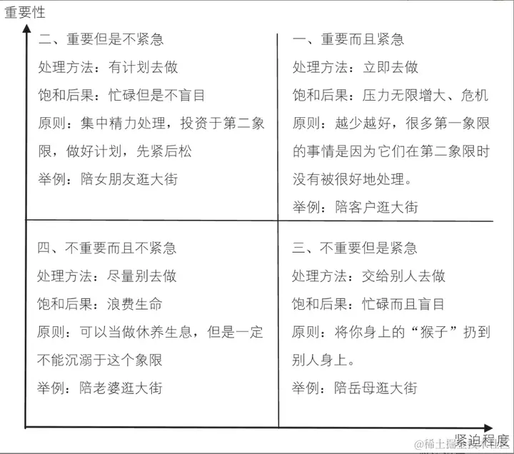 重要而且紧急、重要但不紧急、不重要但紧急、不重要而且不紧急。价值观是你评估一件事情重要程度的标准,而紧迫程度则是任务的时间底线。