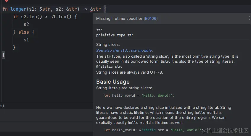 这里返回值并没有生命周期注释,但是加上也无妨。这是一个历史问题,早期 Rust 不支持生命周期自动判断,所有的生命周期必须严格声明,但主流稳定版本的 Rust 已经支持了这个功能。