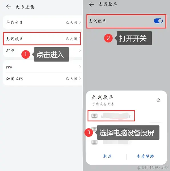 步骤4:在手机设置中搜索 【投屏】 并打开,等待手机自动搜索周围可连接的电脑,然后点击电脑名称连接就可以实现投屏了!