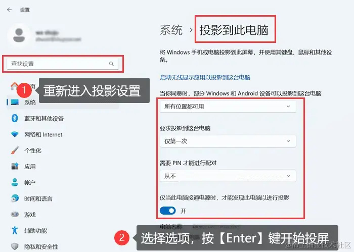 步骤3:安装完成后重新进入 【投影到此电脑】 ,启动无线显示器并选择如图可选项;