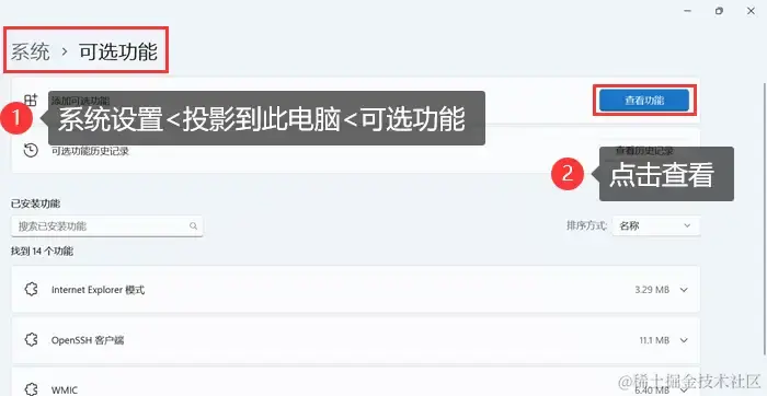 步骤1:在电脑设置中搜索 【投影】 ,进入 【投影到此电脑】 ,并点击 【可选功能】 ;