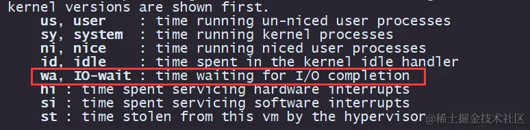 其中,man 手册解释 wa 表示 CPU 在等待 I/O 操作(iowait)的时间百分比。