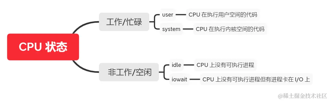1)不要搞混 CPU 状态和进程的状态。进程有 R、S、D、Z、T,5 种状态;CPU 有 4 种状态:工作(user、system 两种)和空闲(idle、iowait 两种)。