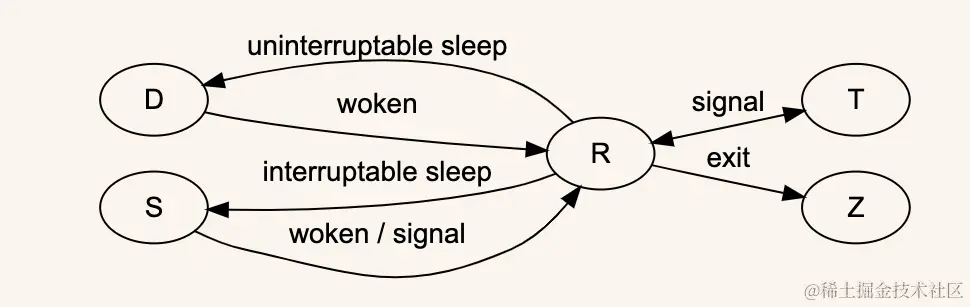 uninterrupted sleep),跟状态 S 类似,只是进程在接收到信号时不会被唤醒。这类状态的进程一般在等待 I/O 结束。 - Z:僵尸状态(