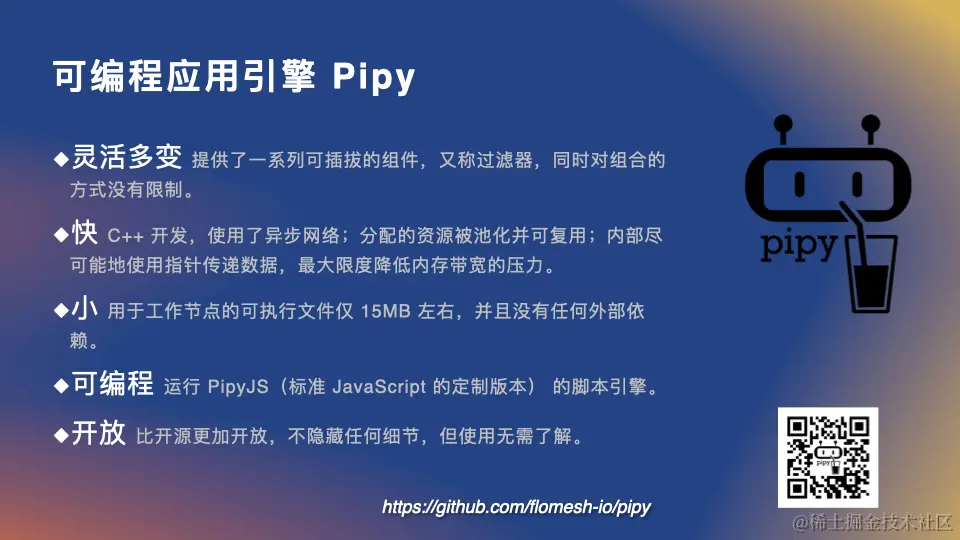 Pipy 是一个开源的可编程应用引擎,它使用 C++ 开发。它支持通过 JS 编程的方式来实现网络流量的处理,以及复杂的应用逻辑,这些功能都可以通过编写 JS 文件来实现。