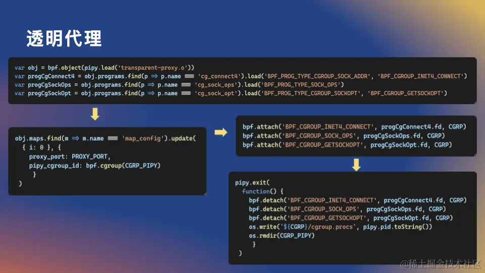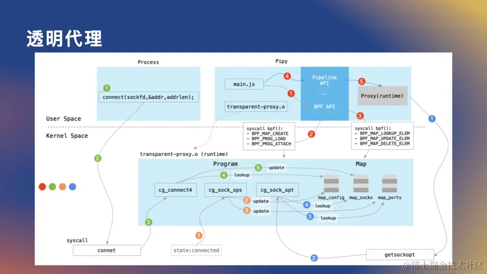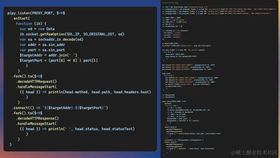 通过 JS 编程,我们可以使用 BPF API 来对 BPF 程序和 Map 进行操作。在同一个进程,甚至是同一个 JS 脚本文件 中,我们还实现了一个 Pipy 代理。