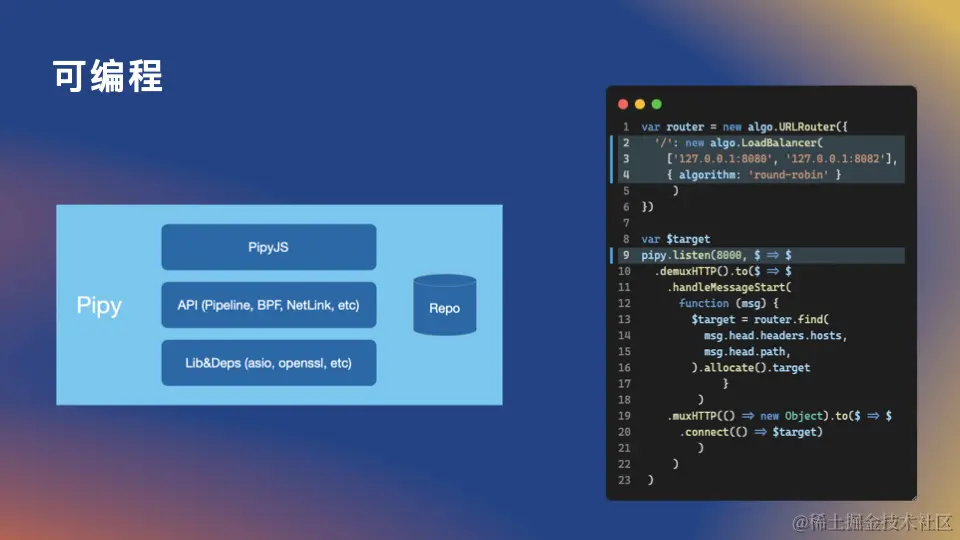 我们可以使用 JS 语法和 Pipy 提供的 API 来编写个简单 HTTP 负载均衡器,这些 JS 代码就是我们上面说的 PipyJS 脚本。
