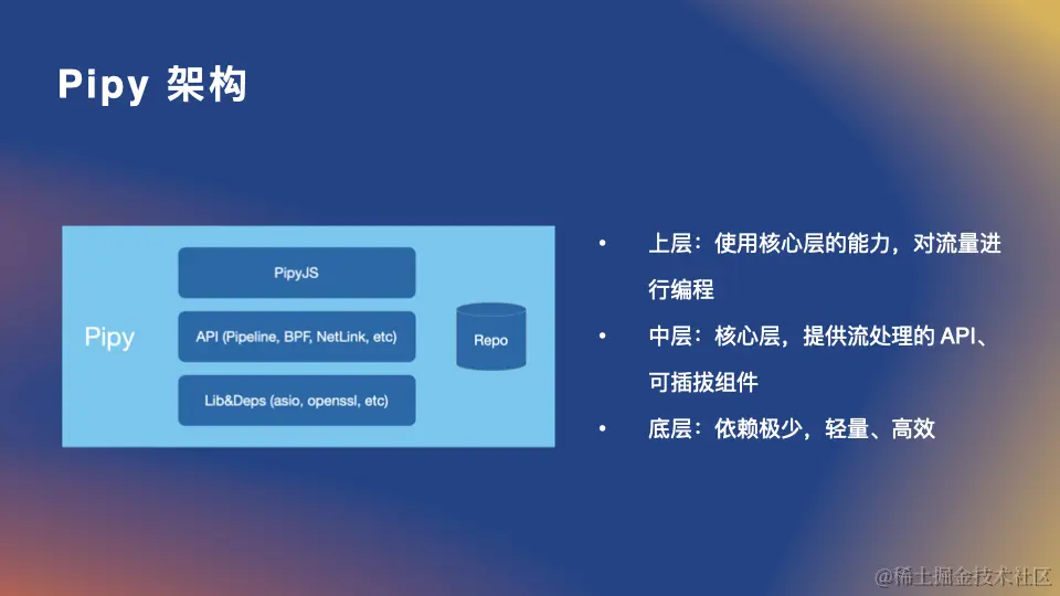 Pipy 是一个单一的可执行文件,无需其他依赖。其分层架构非常简单,底层依赖非常少;中层 API 层是核心层,封装了网络流处理、BPF、NetLink,以及可编程的核心 Pipeline API;上层是一个自研的 JS 引擎,可以处理 PipyJS(标准 JavaScript 的定制版本) 的脚本。