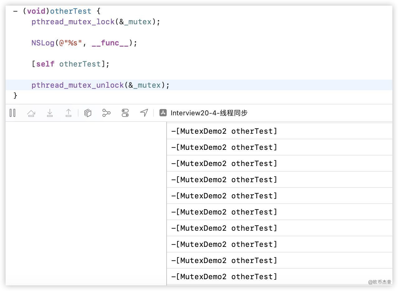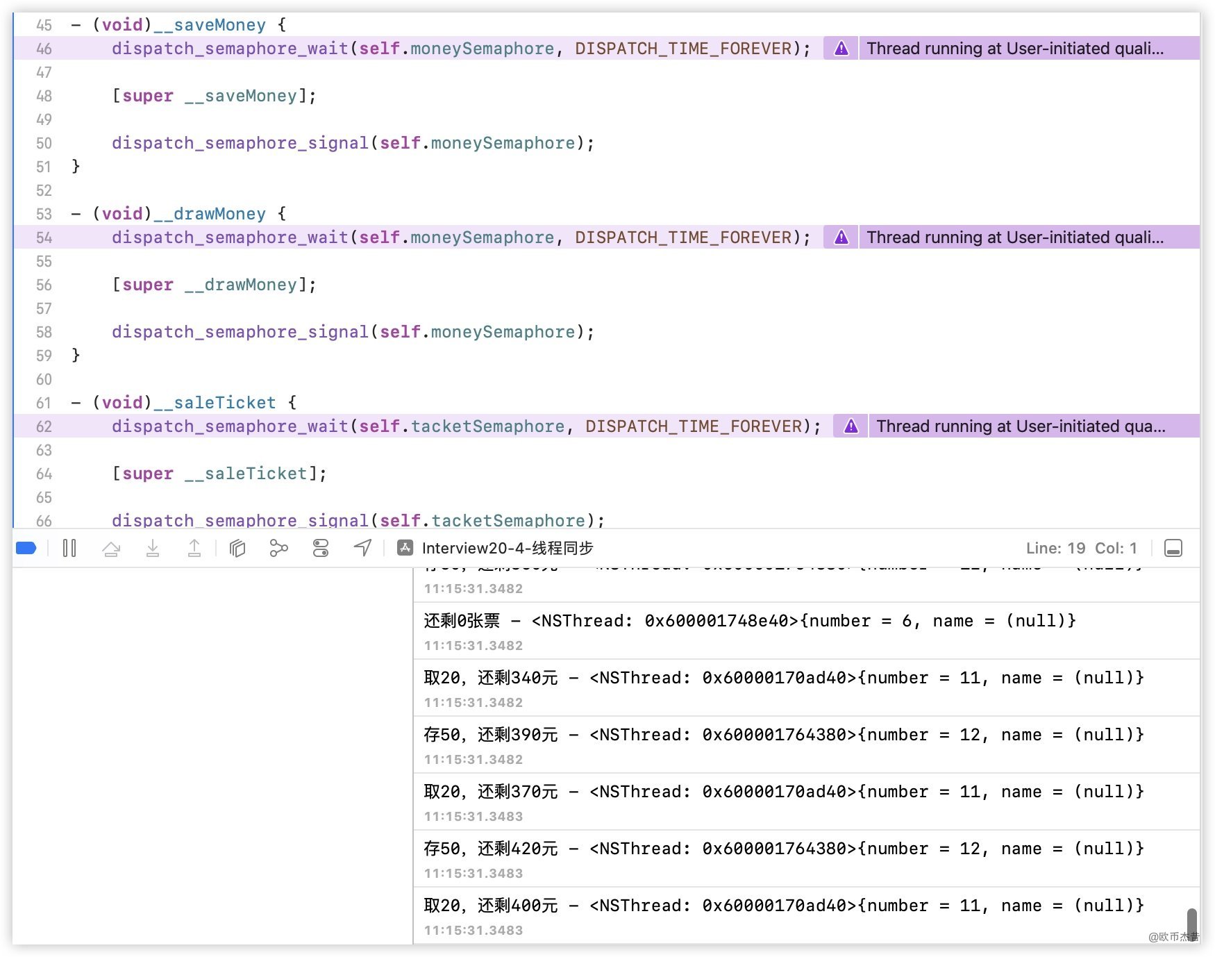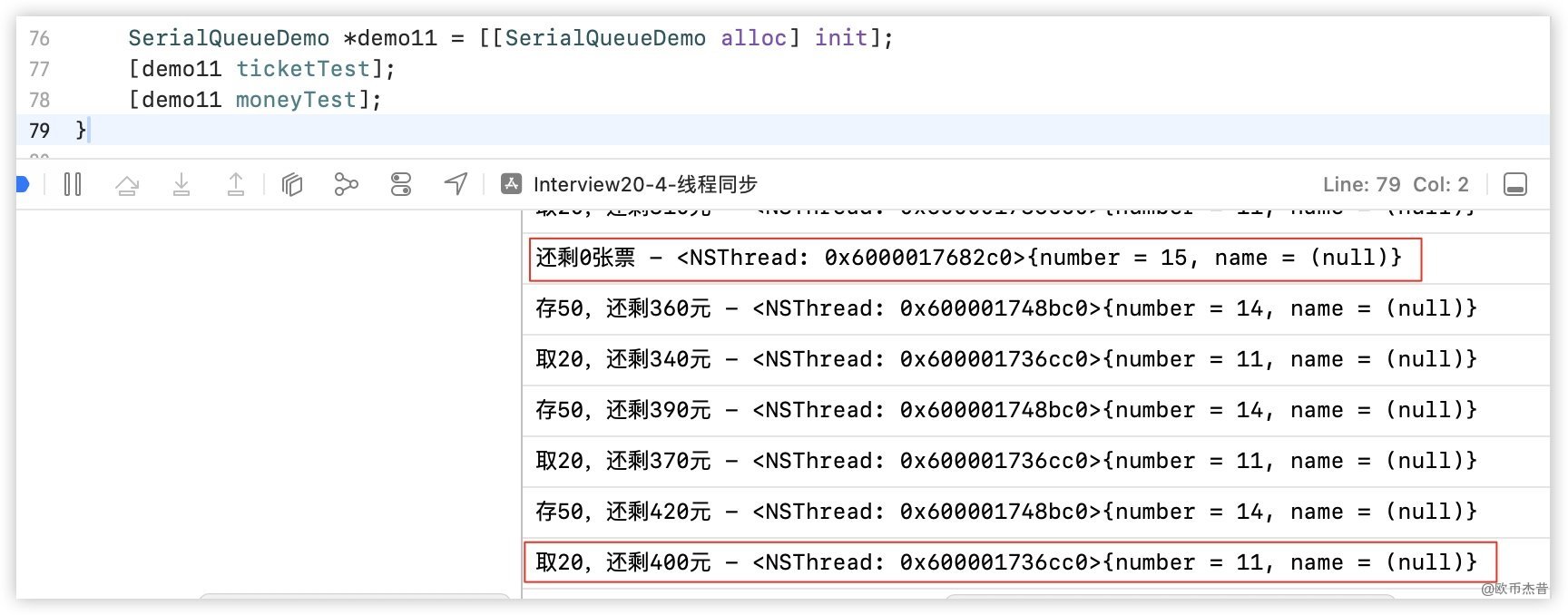 NSLog(@"取20,还剩%d元 - %@", oldMoney, [NSThread currentThread]);