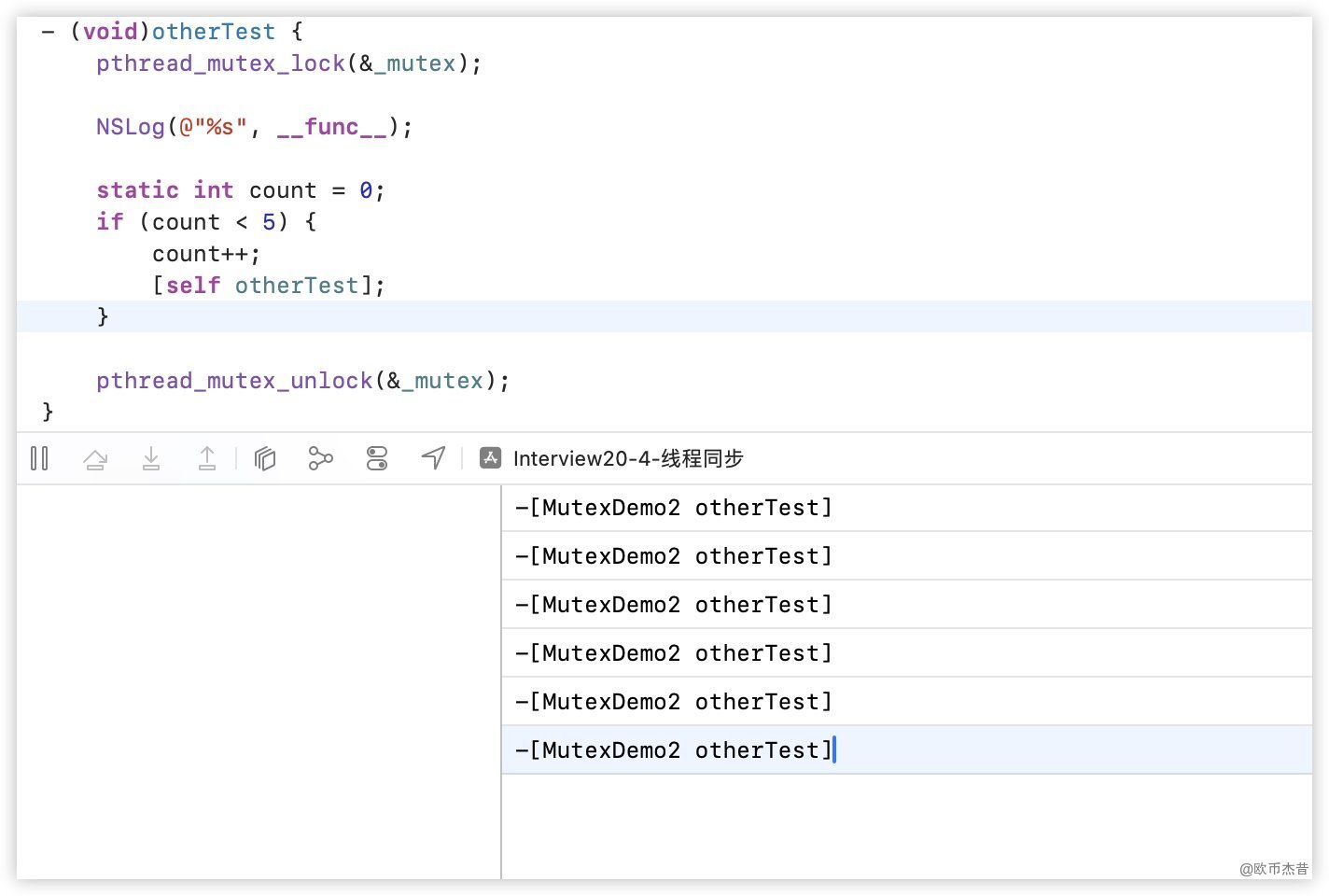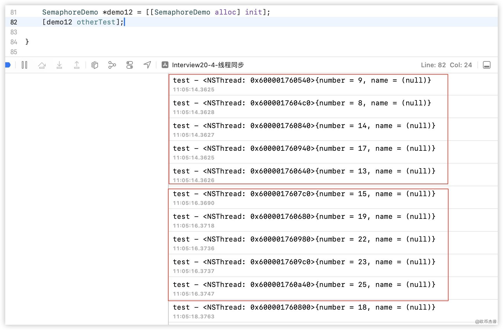 - (void)otherTest方法循环创建20个线程执行- (void)test方法,semaphore初始值设置为5