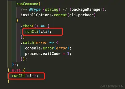 判断中最后都执行了 runCli 函数。只不过在检测到 cli 没安装时候,会做一些校验,提示安装等逻辑(先忽略)。最后都会执行 runCli 函数。