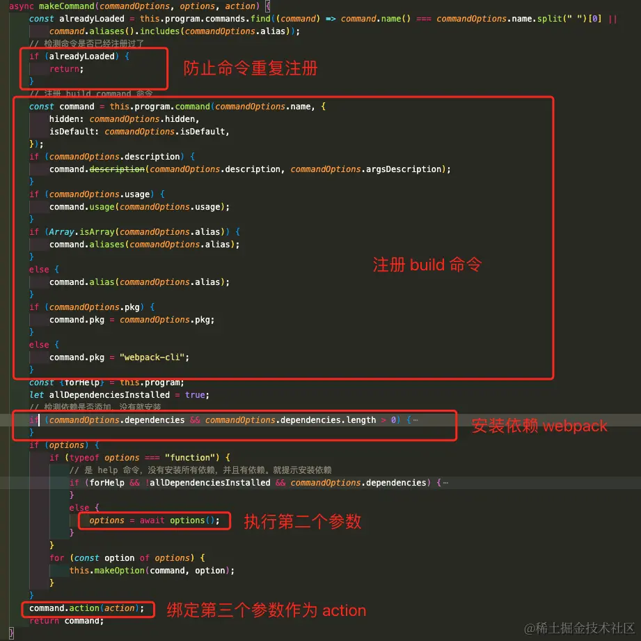 makeCommand 函数。注册 build 命令,检测并安装所需依赖 webpack,然后执行第二个参数,构建 webpack 所需 option。最后使用第三个参数作为 action,处理 build 命令。