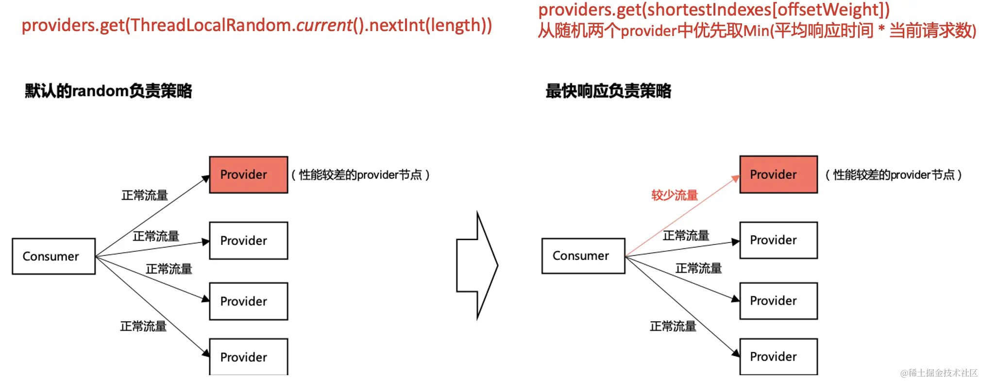 上图中的consumer图是从jsf wiki里摘取,上面的红字是看jsf代码提取的关键信息,总而言之就是:默认的random是完全随机算法,shortestresponse是基于响应时间、请求数加权进行负载均衡,所以使用shortestresponse算法可以很大程度上规避此类问题,类似于熔断的作用(本次解决过程中也使用了jsf的实例熔断、预热能力,具体看jsf wiki,在此不过多介绍)。