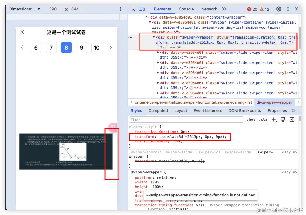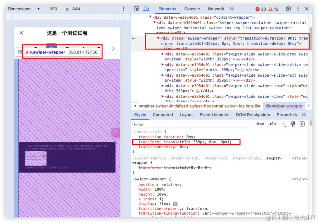 div.swiper-slide的渲染宽度为358.81px,而每次swiper-wrapper滚动是transform变化单位是359px,存在了一定的偏差; - 所以当滚动的页数达到一定量级的时候,这个偏差值就会变得很大,也就出现了上面的内容偏移。
