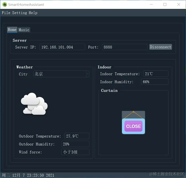 智能网关是整个系统的核心和枢纽,为整个智能家居提供网络,同时与云平台进行交互,不断更新室内信息,实时将数据上传至云端,用户就能在远程进行查室内的各种环境信息,实时掌握家中的最新动态。音乐播放器为用户提供音乐服务。云端部分为智能家居系统云服务,提供输出存储与分析服务。应用软件和语音子系统是等效的,方便用户使用。