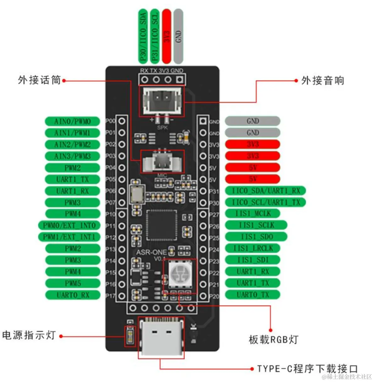 ASR-ONE是一颗专用于语音处理的人工智能芯片, 可广泛应用于家电、 家居、 照明、 玩具等产品领域, 实现语音交互及控制。开发板板载一颗 RGB 灯,引出 26 个 IO,外接喇叭和麦克风,用于快速验证语音产品功能。