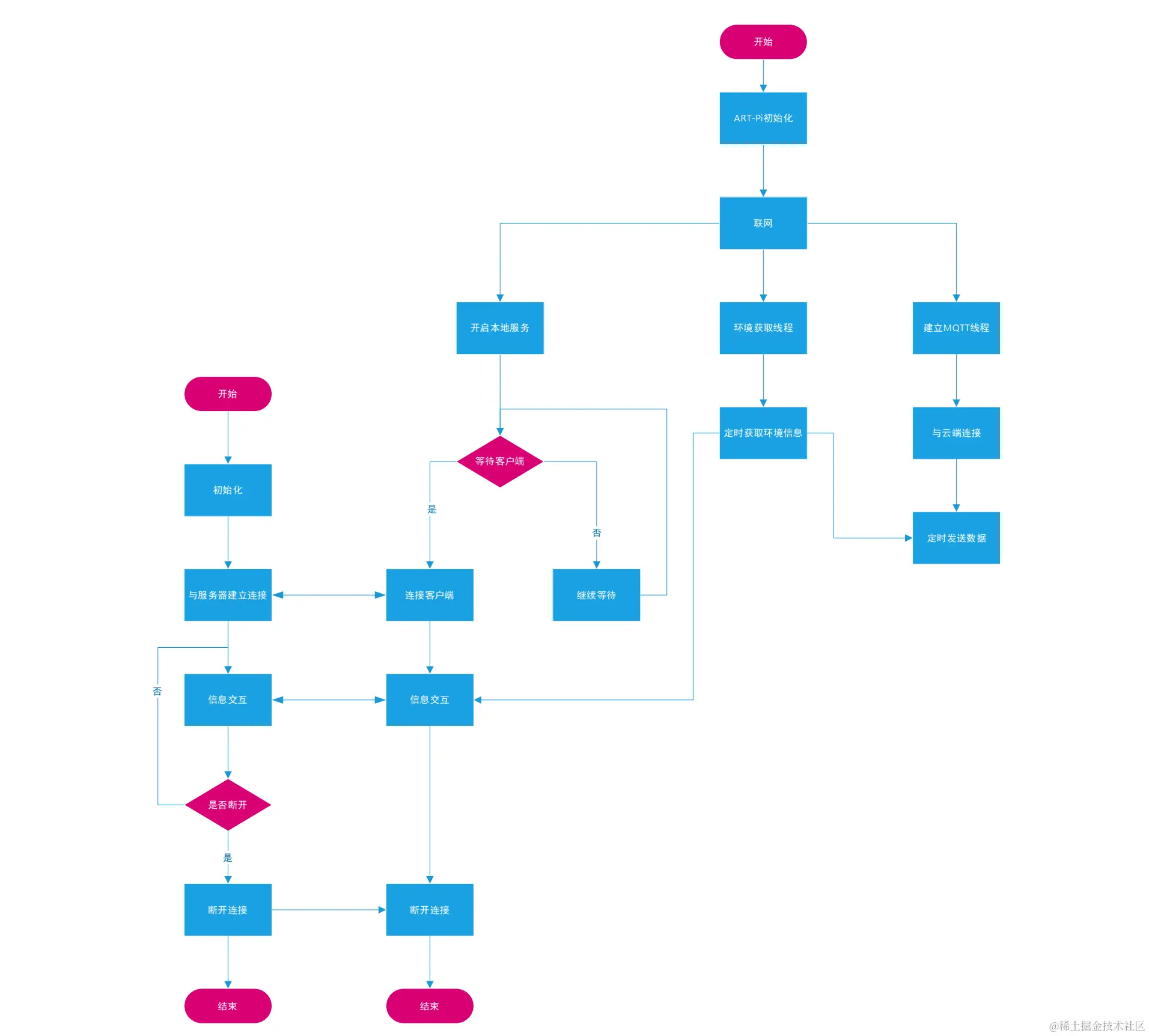 ART-Pi智能网关上电之后完成板级初始化,接着初始化传感器,就会定时采集环境信息,在连接网络和云端后,就会定时向云端发送数据。同时建立本地服务,当有客户端接入网络,也会定时向客户端发送环境信息。