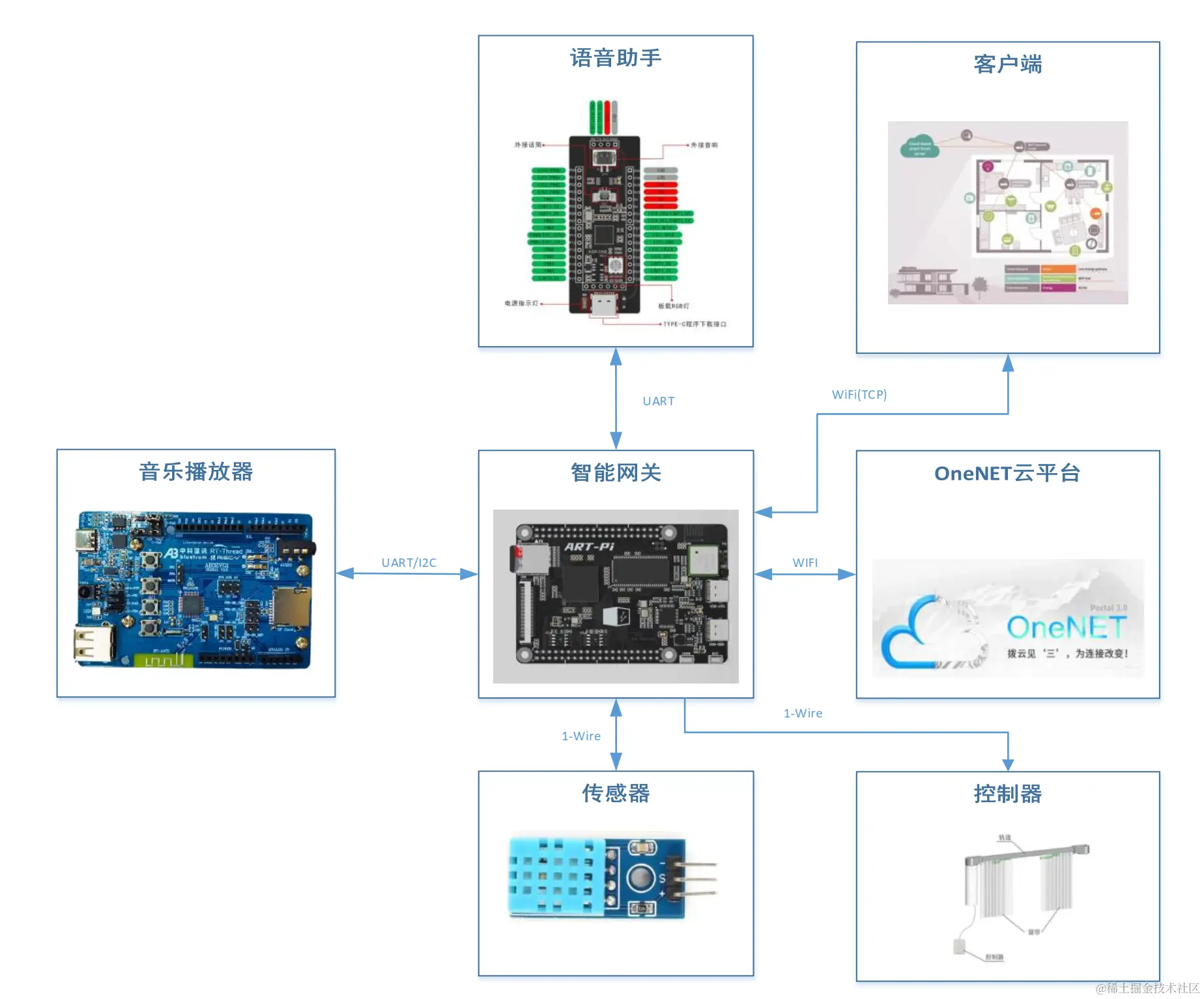 智能家居助手主要基于RT-Thread开发的,该系统主要分为语音子系统,环境监测子系统,智能控制子系统,智能网关子系统,音乐播放器,云端以及应用软件七大部分。语音子系统可通过语音进行人机交互来控制家电设备。环境监测子系统为智能家居提供环境信息输入,实时监测室内的环境信息。智能控制子系统为智能家居提供控制接口,用户可根据实际需求来控制家电设备。
