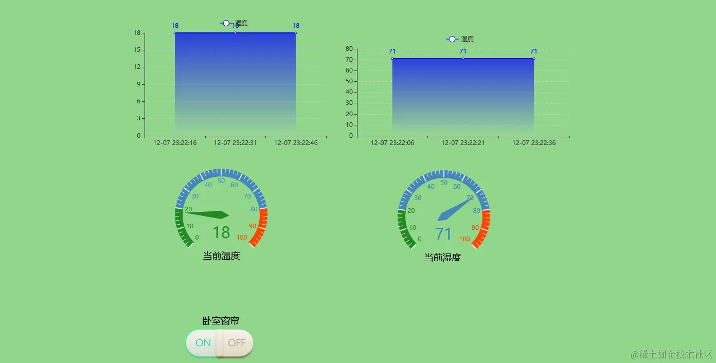 云端得到相应的数据后,绘制室内的温湿度曲线,也可实时查看当前的温湿度信息。