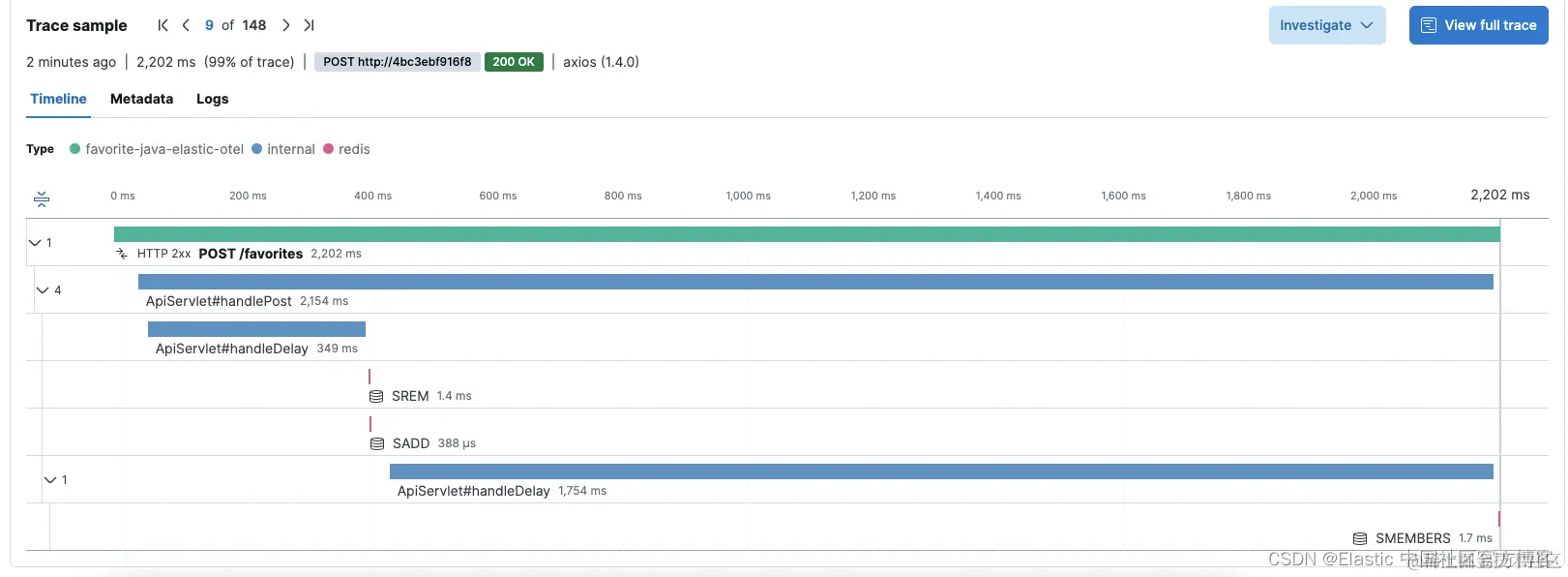 为了演示推断跨度功能,我们将使用 Elastiflix 演示应用程序的 Java 实现。Elasticflix 有一个名为 favorites 的端点,其中执行一些 Redis 调用,并包含人为延迟。首先,我们使用纯 OpenTelemetry Java 代理来检测我们的应用程序: