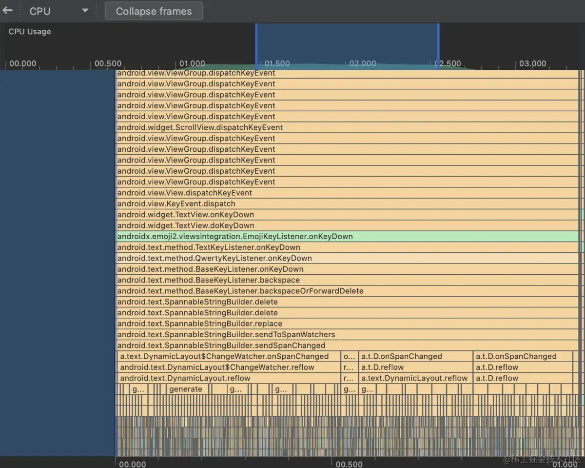 通过分析 Profiler的输出,我们发现有一个类与 emoji2中的 androidx.emoji2.viewsintegration.EmojiKeyListener.onKeyDown方法相关。emoji2 是官方推出的用于适配系统表情的库,我们猜测 emoji2 可能对系统表情进行了特殊优化和处理。查看 emoji2 的源码后,确实发现了对表情输入进行了特殊优化和处理。
