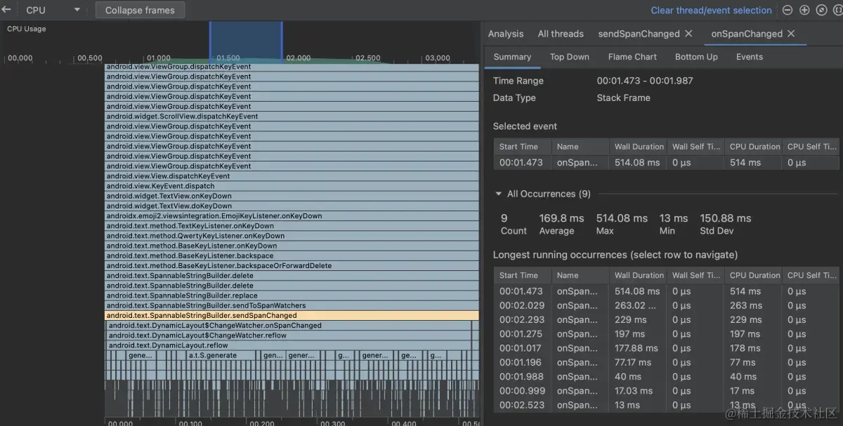 如图所示,当从中间删除一个表情时,耗时方法从SpannableStringBuilder.delete执行到SpannableStringBuilder.sendSpanChanged方法,SpannableStringBuilder.sendSpanChanged方法调用了DynamicLayout$ChangeWatcher.onSpanChanged,执行了很多次,并且每次调用非常耗时。