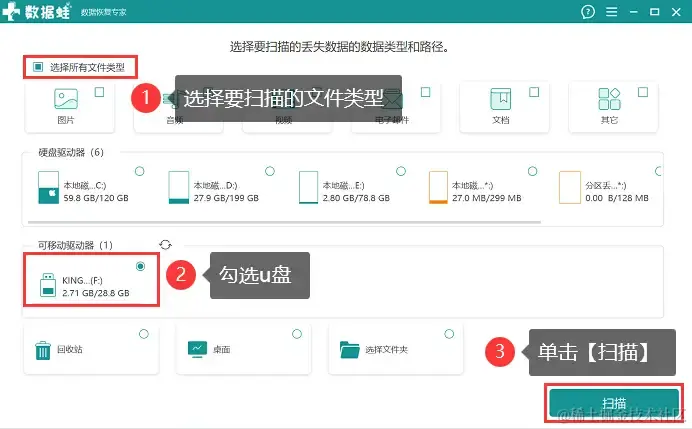 比较推荐的一款是数据蛙恢复专家,它的操作步骤比较简单,并且恢复功能比较强大,对我们恢复误删数据是更为便利的。并且软件是支持免费试用的,我们可以先对u盘进行扫描。