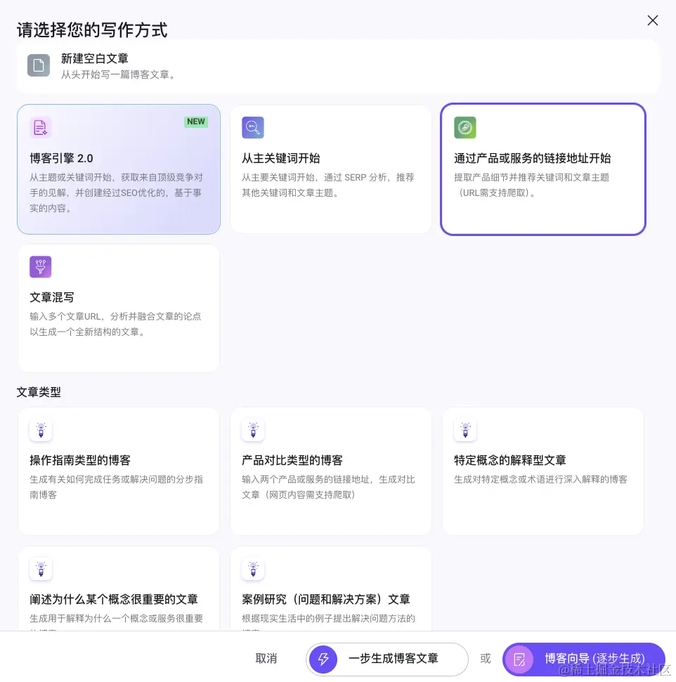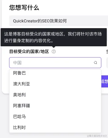 | 生成内容 | 针对SEO博客文章 | ✅更多选择 |