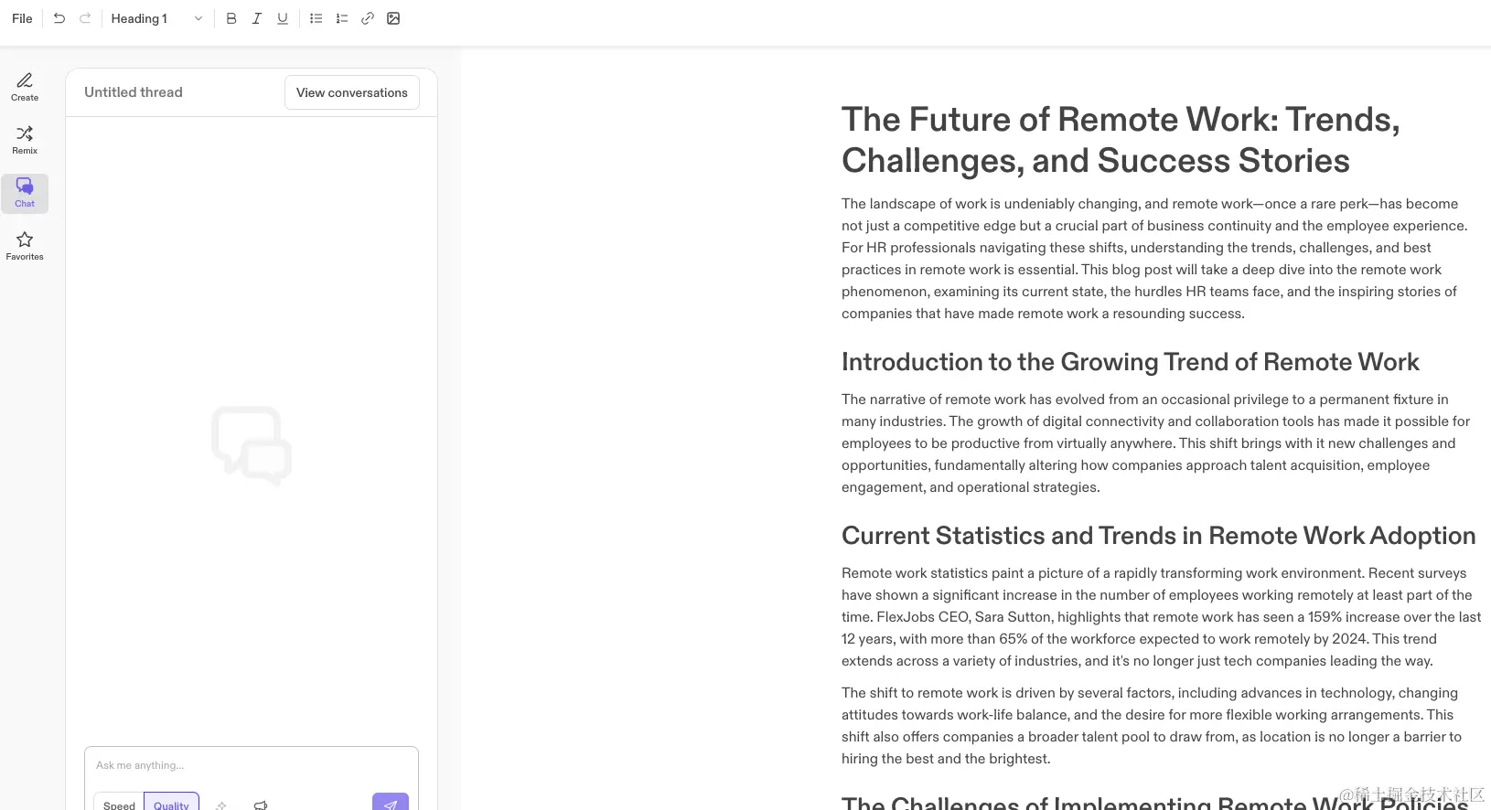 QuickCreator相对来说就简单多了,只需要根据提示输入关键词和需求,就能得出一篇基本符合需求的SEO文章了。另外生成了的内容非常方便编辑,可以插入很多元素,让我们的内容更加丰富。对于没有任何技术背景的SEOer来说,都能凭一己之力完成一个基本符合要求的SEO网页页面。