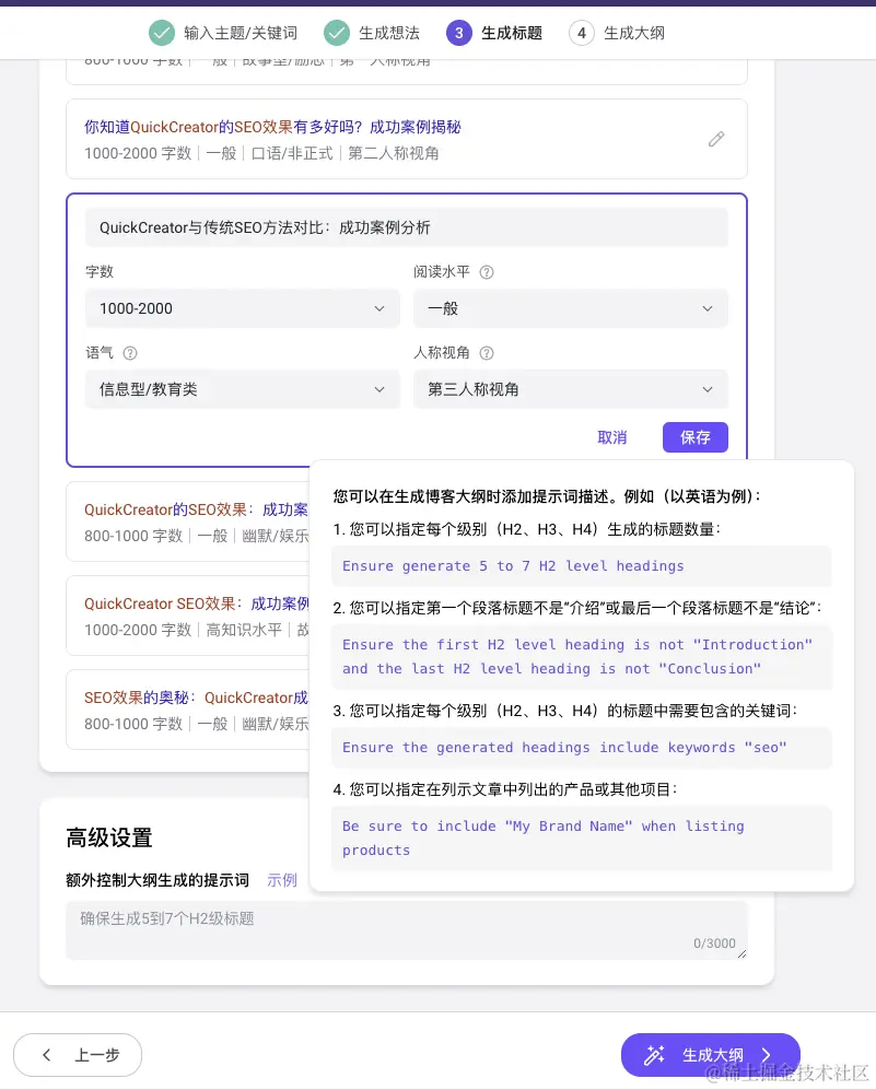 另外,从他们的操作指引中可以看到,多步骤的生成向导可以很好的帮助我们控制生成结果。