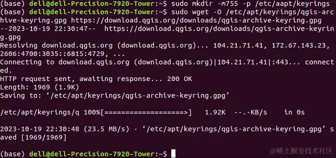 随后,再执行如下代码。这个命令将从后面那个网站中,下载、安装QGIS的签名密钥,安装的位置就是上一句代码指定的文件夹。