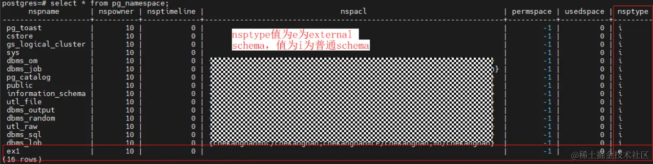 2 普通schema在创建后会将schema的信息记录在pg_namespace中,external schema创建后和普通schema一样也会记录在pg_namespace,可以通过pg_namespace中的nsptype字段区分是external schema还是普通schmea。