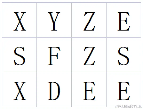 单词由相邻单元格的字母连接而成,相邻单元指的是上下左右相邻。同一单元格的字母不能多次使用。