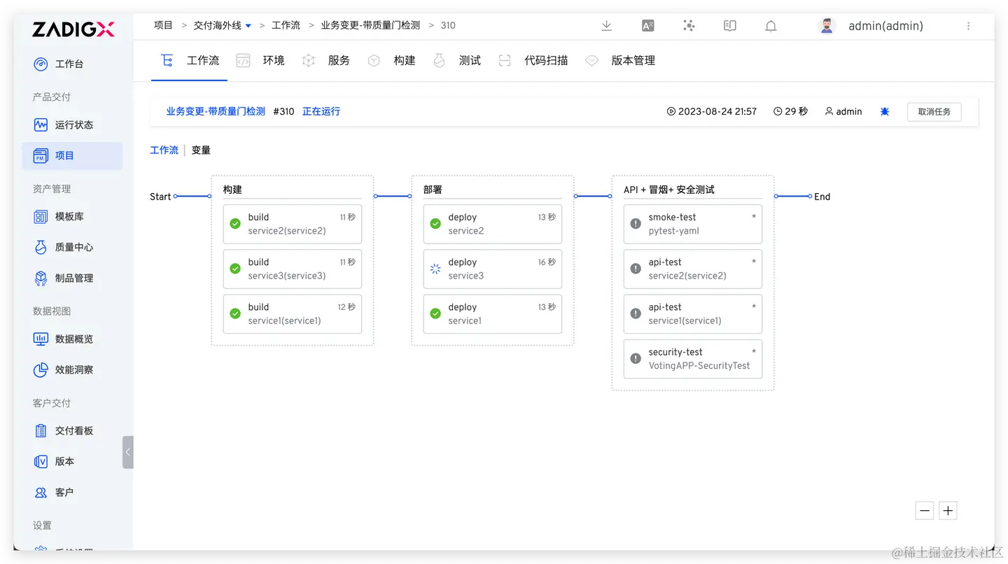 Zadig 工作流具备灵活易用的高并发能力,实现多个微服务的并行构建、部署和测试支持,提升代码验证效率和交付速度。Zadig 工作流同时支持灵活编排蓝绿部署、金丝雀部署、分批次灰度等策略,确保发布过程的透明性和可靠性,以满足不同国家和地区的发布要求。