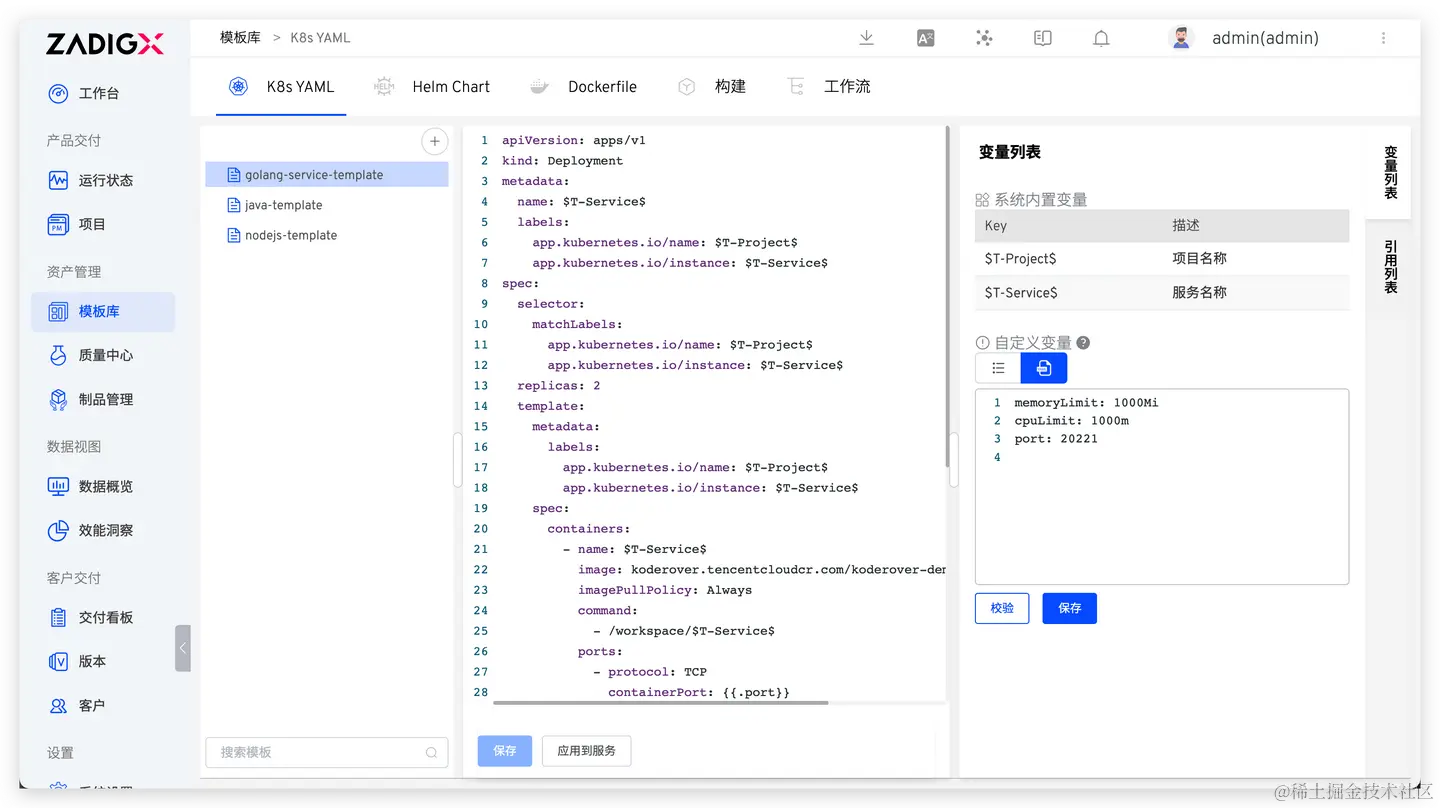 Zadig 提供强大的免运维模板库,包括 K8s YAML 模板、Helm Chart 模板等,实现配置的统一管理,减轻运维管理负担。它还促进了研发交付流程和最佳实践的共享,推动配置的标准化和复用。