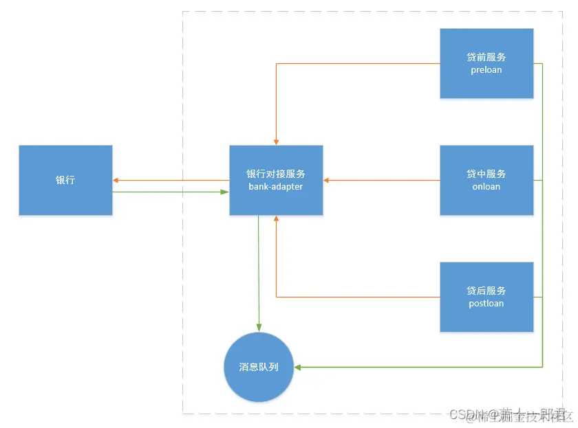 橙色线条表示业务服务(贷前、贷中和贷后)通过银行对接服务bank-adapter向银行主动发起查询,包括查询:企业准入结果、授信结果、融资申请结果、放款结果和还款结果。