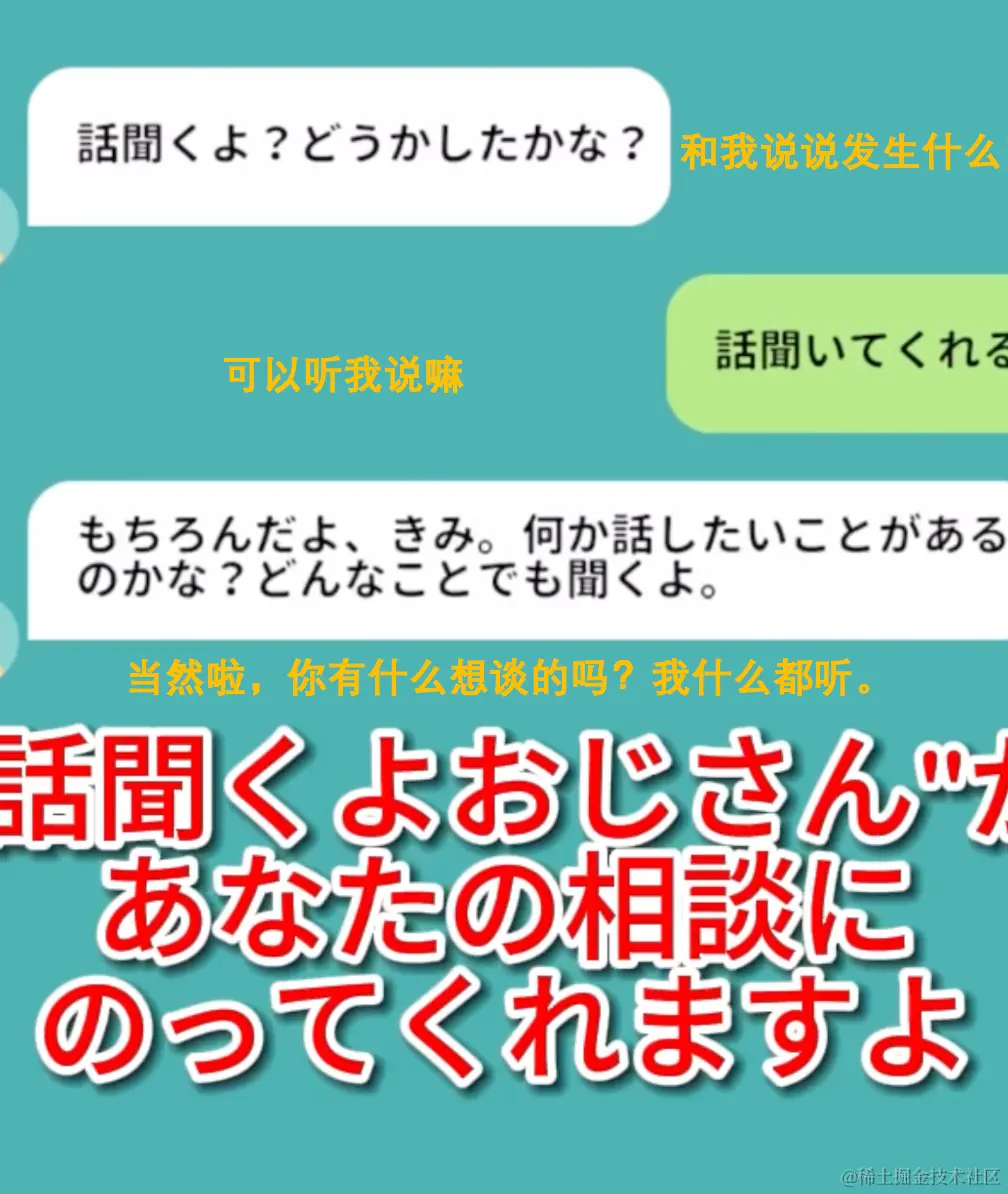 通过淡化AI机械感,【話聞くよおじさん(听我说,老头)】反而塑造出一种别样的亲切感,就是那种“老头没文化,老头也不会说话但是老头爱你”的亲民感。格外有种知心姐姐、寄宿妈妈的温暖感。此外,【話聞くよおじさん(听我说,老头)】的对话页面与市面上大多数即时通讯软件类似,额外更添一份与好朋友聊天的亲密气氛。