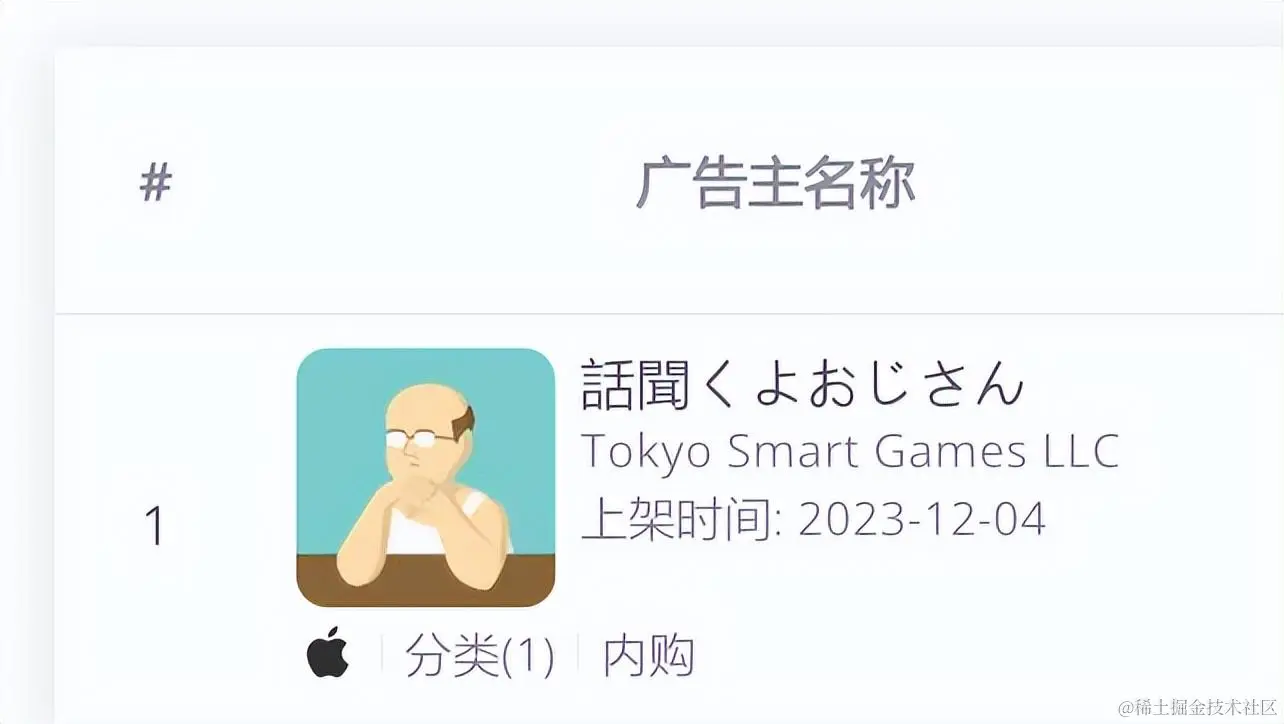 可以说看完【話聞くよおじさん(听我说,老头)】的种种营销手段,笔者对它背后的研发公司可以说期待值拉满了。根据广大大抓取数据显示,【話聞くよおじさん(听我说,老头)】是由日本手游公司Tokyo Smart Games于2023年12月4日正式发行。